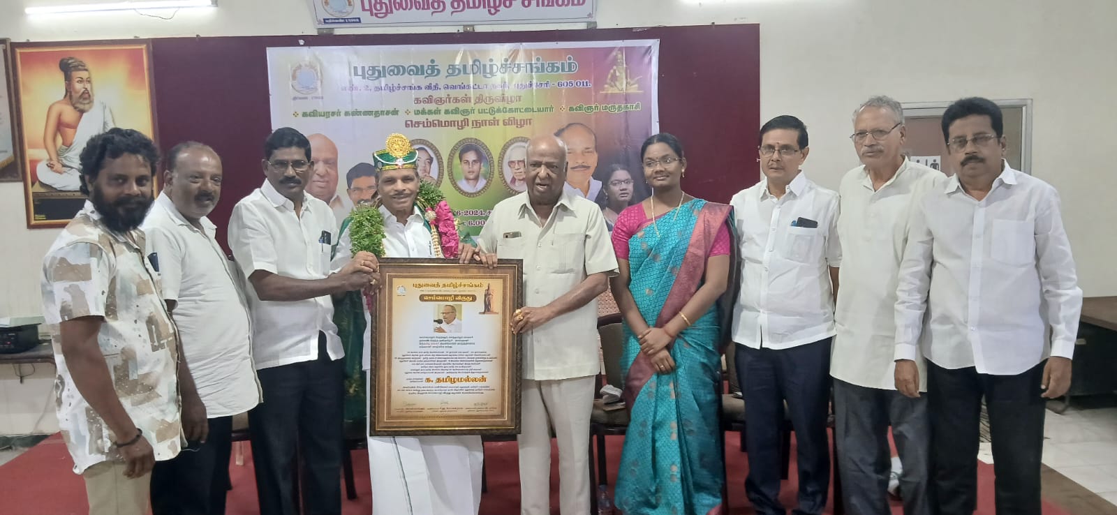 புதுவை தமிழ்ச் சங்கம் சார்பில் கவிஞர்கள் திருவிழா செம்மொழி நாள் விழா நேற்று இரவு நடந்தது. புதுச்சேரி தமிழ்ச் சங்கத்தில் நடைபெற்ற விழாவிற்கு சங்கத்தின் தலைவர் முத்து தலைமை தாங்கினார். செயலாளர் சீனு மோகன்தாஸ் வரவேற்றார். துணைத்தலைவர்கள் ஆதிகேசவன், திருநாவுக்கரசு, பொருளாளர் அருள் செல்வம், துணை செயலாளர் தினகரன் முன்னிலை வகித்தனர். கருத்தரங்கில் கண்ணதாசன் ஒரு மீல் பார்வை என்ற தலைப்பில் காருண்யா நடராசன், கவிஞர் மருதகாசி பாடல்களின் சிறப்புகள் என்ற தலைப்பில் தமிழ் சங்கத் தலைவர் முத்து, மக்கள் கவிஞர் பட்டுக்கோட்டையார் என்ற தலைப்பில் சங்க செயலாளர் சீனு மோகன்தாசு ஆகியோர் உரையாற்றினர்.தனித்தமிழ் இயக்க தலைவர் தமிழமல்லனுக்கு செம்மொழி விருது வழங்கப்பட்டது. செம்மொழி தமிழ் மொழி என்ற தலைப்பில் நடந்த பாவரங்கில் தாகூர் அரசு கலைக்கல்லூரி முன்னாள் தமிழ் துறை தலைவர் அவ்வை நிர்மலா பேசினார்.…