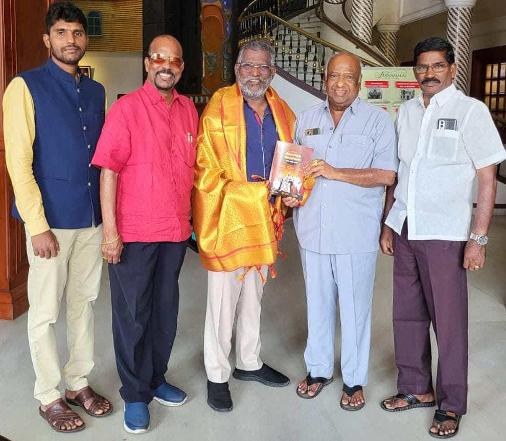பொன்னாடை அணிவித்து தீந்தமிழ் திறவுகோல் எனும் நூலினை வழங்கினார். உடன் புதுவை தமிழ்ச் சங்கச் செயலர் பாவலர் சீனு.மோகன்தாசு, மலேசிய தமிழ் எழுத்தாளர்கள் சங்கப் பொருளர் ஞான சைமன், குளோபல் சங்கமம் தினேஷ் ஆகியோர் உள்ளனர்.