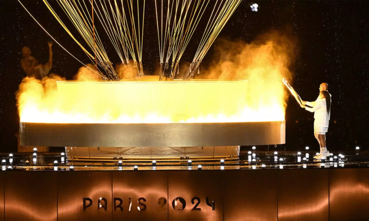 இதனைத்தொடர்ந்து தொடர்க்கவிழாவின் முக்கிய நிகழ்வான ஒலிம்பிக் ஜோதியை ஏற்றும் சடங்கு தொடங்கியது. பிரஞ்சு கால்பந்து ஜாம்பவான் ஜினாதினே ஜின்டேன் முதலில் ஜோதியை ஏந்திய நிலையில் ஜோதியானது ரபேல் நடால், செரினா வில்லாமஸ், நாடியா கோமானேசி என பலர் கைகளுக்கு மாறி இறுதியாகப் பிரான்ஸ் தடகள வீராங்கனை மேரி ஜோஸ் பியர்ஸ் மற்றும் ஜூடோ வீரர் டெடி ரைனர் ஆகியோர் கைகளுக்கு வந்தது. அவர்கள் இருவரும் கூட்டாக இணைந்து பாரிஸ் ஐபில் கோபுரம் அருகே ராட்சத பலூனில் அமைக்கப்பட்ட கால்ட்ரனில் [cauldron] ஜோதியை ஏற்றினர்.