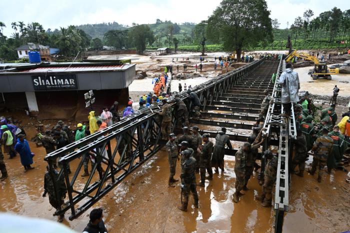 முண்டக்கை பகுதியில் நேற்று பெய்த கனமழையால் ராணுவத்தினர் அமைத்து வந்த தற்காலிக இரும்புபாலத்தின் பணி கைவிடப்பட்டது. இன்று மழை குறைந்துள்ளதை அடுத்து ராணுவம் மீண்டும் பாலத்தின் கட்டுமான பணியை தொடங்கிய நிலையில் தற்போது பாலம் முழுவதுமாக கட்டிமுடிக்கப்பட்டது. மெட்ராஸ் ரெஜின்மெண்ட்டை சேர்ந்த ராணுவ பொறியாளர்கள் உட்பட, 123 பேர் இணைந்து இந்த மேம்பாலத்தை அமைத்தனர். நிலச்சரிவால் பெரிதும் பாதிக்கப்பட்ட முண்டக்கை பகுதியை இணைக்க சாலைகள், பாலம் அனைத்தும் அடியோடு மண்ணில் புதைந்த நிலையில் தற்காலிகமாக அமைக்கப்பட்டுள்ள இந்த இரும்பு பாலம் முண்டக்கை பகுதியில் மீட்புப் பணிகளை துரிதமாக மேற்கொள்ள உதவும் என எதிர்பார்க்கப்படுகிறது.