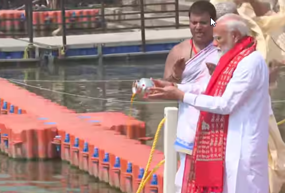 வேத பட்டர்கள் மந்திரம் ஓத, பிரதமர் கங்கை நதியில் மலர்கள் தூவி வணங்கினார். தொடர்ந்து ஆங்கில தொலைக்காட்சிக்கு அளித்த பேட்டியில் கங்கை நதியின் புனிதத்தை எடுத்து கூறினார். அவர் கூறியதாவது: கங்கை நதியின் தத்துப்பிள்ளை நான். எனது தாய் மறைவுக்குப்பின் கங்கை குறித்து மிக நெருக்கமாக உணர்கிறேன். கங்கை என்னை வலுப்படுத்தி தேற்றியது. கங்கை நதி தாயை போல் அனைவரையும் காக்கிறது. இவ்வாறு அவர் கூறினார்.