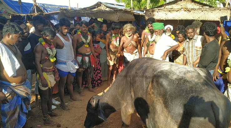 இதுகுறித்து நம்மிடம் பேசிய அந்த மக்கள், “எங்கள் குலத்தை காக்க காளி, அசுரனை வதம் செய்தார். அப்போது தரையில் விழுந்த அசுரனின் ஒவ்வொரு சொட்டு ரத்தமும் மீண்டும் அசுரனாக உருவெடுத்தது. இதனால் காளி அசுரனின் ரத்தம் தரையில் விழாமல் குடித்தார். அதேபோல் நாங்கள் எருமையை அசுரனாக நினைத்து பலியிட்டு, ரத்தத்தை தரையில் வடியாமல் பிடித்துக் குடிக்கிறோம்” என்றனர்.