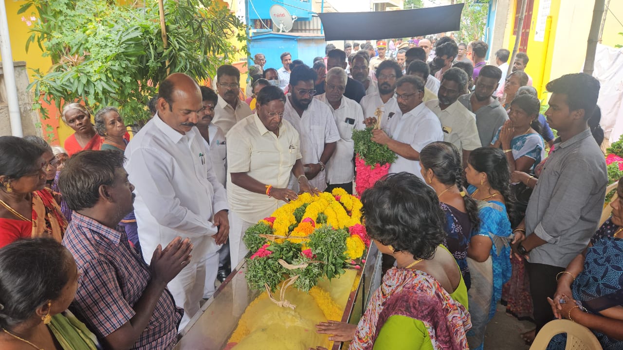 புதுச்சேரியில் விஷவாயு தாக்கி உயிரிழந்த 3 பேரின் உடல்களுக்கு முன்னாள் முதல்வர் நாராயணசாமி, சட்டமன்ற உறுப்பினர் வைத்தியநாதன், முன்னாள் சட்டமன்ற உறுப்பினர் பாலன் ஆகியோர் மாலை அணிவித்து அஞ்சலி செலுத்தினர்