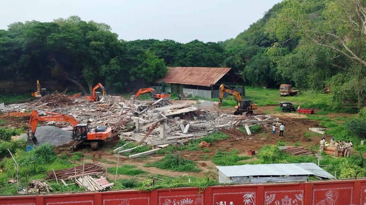கட்டுமானப் பணிகள் முடியும் தருவாயில் இருந்த நிலையில், ஆந்திராவில் ஆட்சி மாறியது. ஆதலால், இக்கட்டிடம் நில ஆக்கிரமிப்பு செய்து, சட்டத்தை மீறி கட்டியது என்பதால் நேற்று அதிகாலை 5.30 மணியில் இருந்து மாநகராட்சி அதிகாரிகள் 2 ஜேசிபி இயந்திரங்கள் கொண்டு இடித்தனர்.