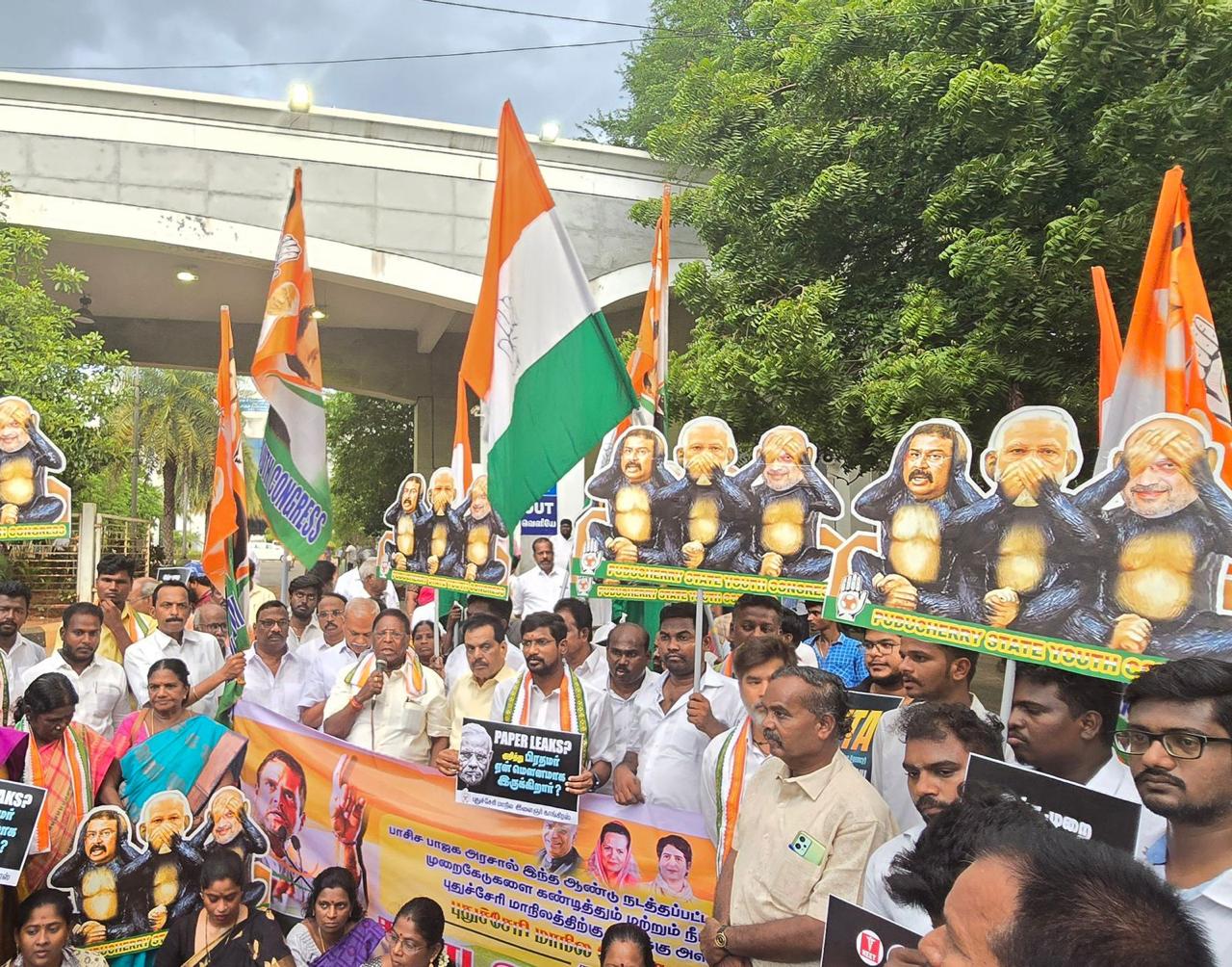 நீட் தேர்வுக்கு விலக்கு அளிக்க கோரியும், நீட் தேர்வு வினாத்தாள் முறைகேடுகளை கண்டித்து இளைஞர் காங்கிரஸ் தலைவர் ஆனந்த்பாபு நடராஜன் தலைமையில் கதிர்காமம் அரசு மருத்துவக் கல்லூரி மருத்துவமனை முன்பு கண்டன ஆர்ப்பாட்டம் நடைபெற்றது.